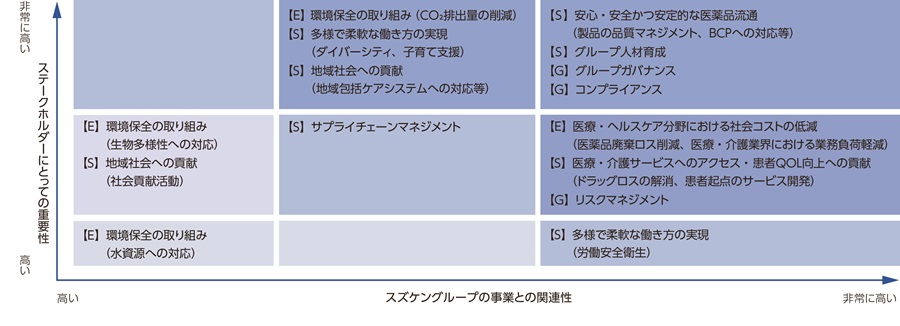 スズケングループは、社会課題の解決と社会コストの低減に貢献する新しい価値を創造し続けることをパーパス(存在意義)とし、新たな価値創造を支える基盤にESG重要課題(マテリアリティ)を位置付けています。対応すべき社会課題は、バリューチェーン全体を見渡し、事業に関わる情勢の変化や社会動向を踏まえ抽出しています。そのうえで、優先度の高い社会課題をESGに分類し、機会とリスクも考慮したうえでマテリアリティを特定しています。